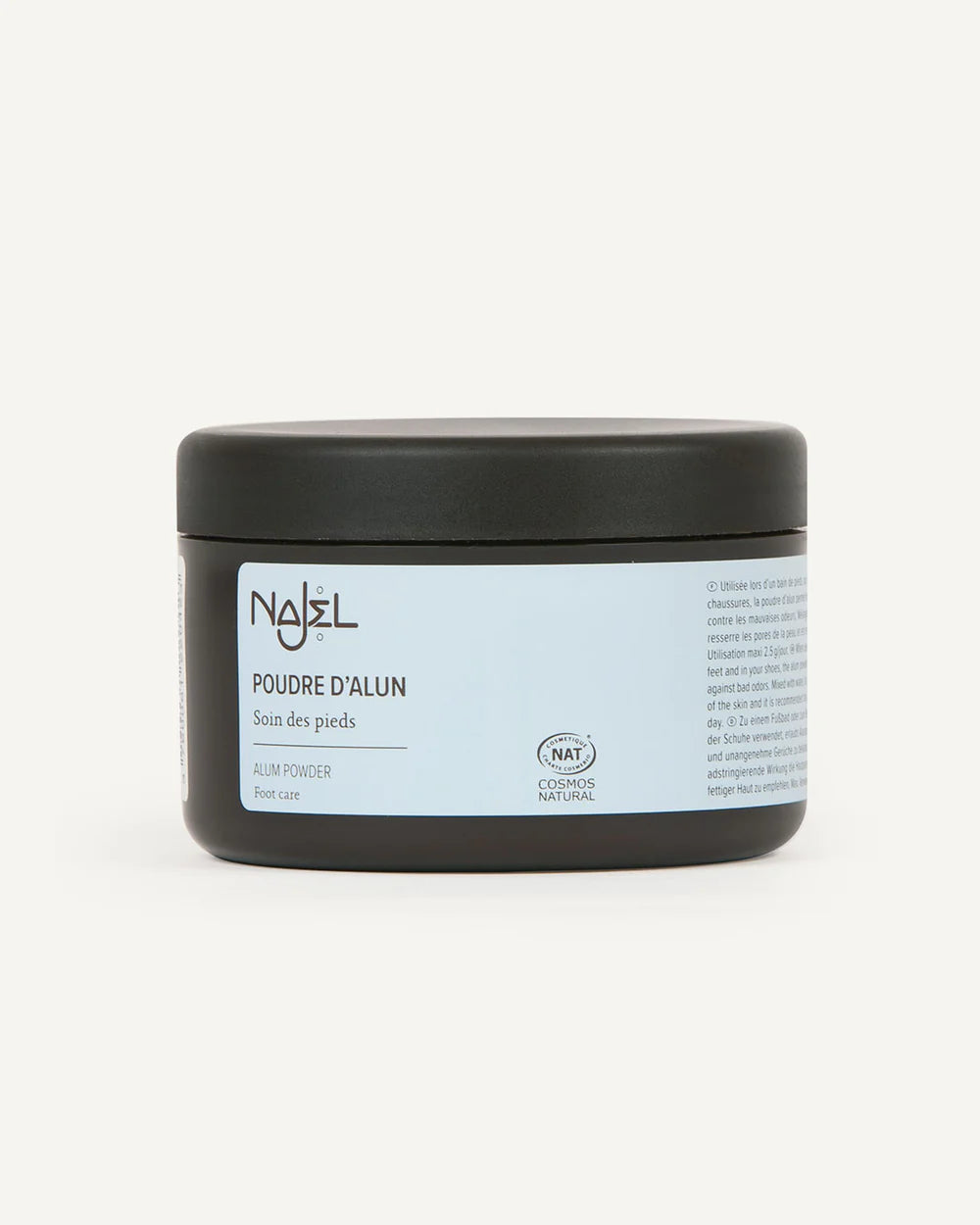 Upptäck vårt alunpulver, en naturlig behandling känd för sina många fördelar. Najels alunpulver utvinns ur alunkristaller direkt från naturliga alunitbrott – en mineral med renande och lugnande egenskaper. Alunsten är ett mineral som förekommer naturligt i olika delar av världen och mals till fint pulver av en specialist i Frankrike. Alunsten har använts i århundraden för att reglera svettning och eliminera dålig lukt. Berikat med naturliga mineraler ger detta parfymfria pulver en skonsam och uppfriskande känsla för dina fötter och neutraliserar svettlukt. Byt till en ren och naturlig hudvårdsrutin med vårt alunpulver.