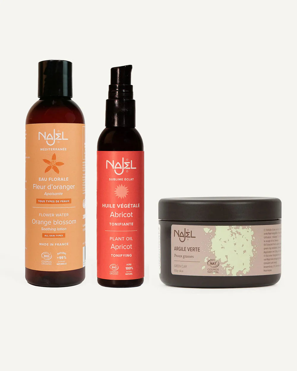Fly vardagen och njut av en stunds välbefinnande med vårt detoxkit. Skapat för att vårda och revitalisera din hud, kombinerar detta set de renande egenskaperna hos grön lera, de lugnande fördelarna med apelsinblomsvatten och den intensiva återfuktningen från aprikoskärnolja. Perfekt för att eliminera orenheter och balansera överskott av talg, hjälper det dig att återfå en fräsch och strålande hud. De naturliga ingredienserna, rika på vitaminer och mineraler, samverkar för att dra ihop porerna och ge din hud ny lyster.