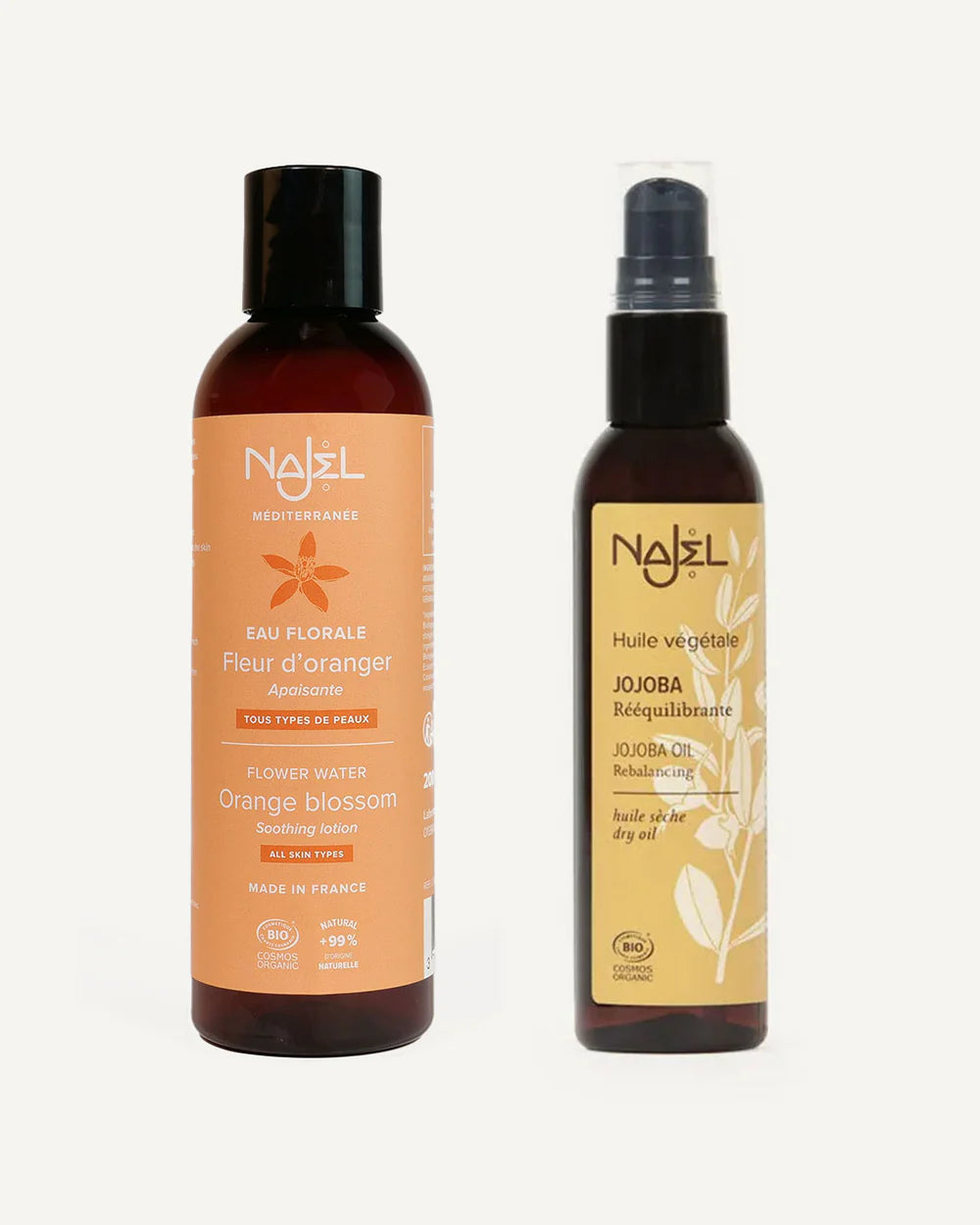 Upptäck vårt sminkborttagningskit, den perfekta allierade för en ren och makeupfri hud. Apelsinblomsvatten ger en uppfriskande känsla och lugnar även den mest känsliga huden tack vare sina milt vårdande egenskaper. I kombination med jojobaolja, känd för sin balanserande och närande verkan, avlägsnar det effektivt makeup och orenheter samtidigt som hudens naturliga balans bevaras.
