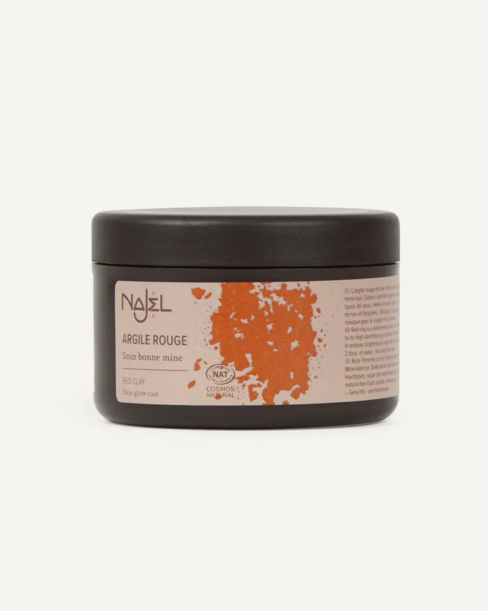 Röd lera: lera, en naturlig ingrediens, renar och vitaliserar hud och hår. Dess lugnar irritationer, absorberar överflödigt talg och stramar upp porerna. För klar hud och strålande hy och glänsande, ljust hår är lera den idealiska lösningen. Najel röd lera utvinns från ett stenbrott i Auvergnene nära Puy-en-Velay.
